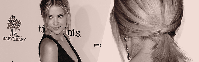 Ashley Benson a Baby2Baby Gln tnt fel, frizurjt Bridget Brager ksztette, aki kt tincset tekert a sznszn alacsony copfja kr (kpet lsd fent).